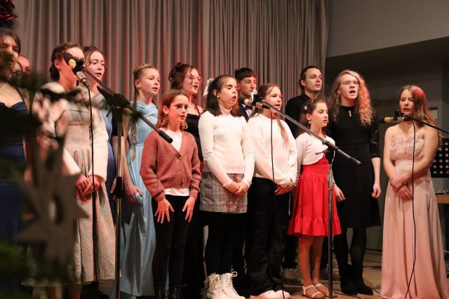 Weihnachtsmelodien, leckere Plätzchen und Glühweinduft - so empfingen die Freytagianer ihre zahlreichen Gäste zum traditionellen Konzert am 12.12.2025 in der Aula der Verwaltungsfachschule. Die Schülerinnen der Tanz - AG, geleitet von Frau Machleb, gestalteten mit ihren winterlichen Interpretationen von „All I want for Christmas“ und anderer Hits den Rahmen des umfangreichen Programms. Patricia, Mattis, Lenara und Arthur begeisterten mit ihren Darbietungen am Klavier und intonierten verschiedene Filmmelodien. Camillo ließ mit seinem Saxophon das „Winter wonderland“ erscheinen, Clara erinnerte mit „Küß mich, lieb mich, halt mich“ daran, dass zum Advent natürlich „Die drei Haselnüsse für Aschenbrödel“ gehören. Aber auch nachdenkliche Töne erklangen, so von Lenara, Filina, Ara, Magdalena und Frederic, die mit aktuellen Titeln von Keane und Coldplay aber auch dem traditionellen „Stern über Bethlehem“ ihre stimmliche Brillianz unter Beweis stellten. Zudem stellte Frederic mit dem französischen Gedicht „Mon cartable“ den Inhalt eines Schulranzens vor.
