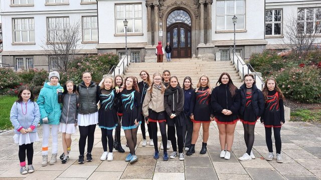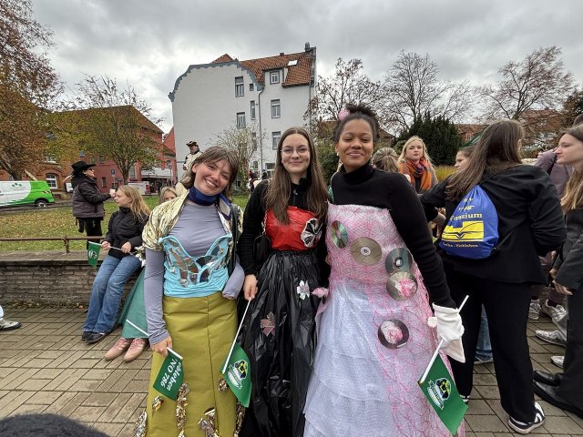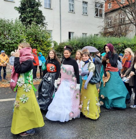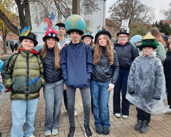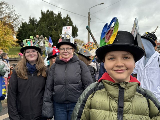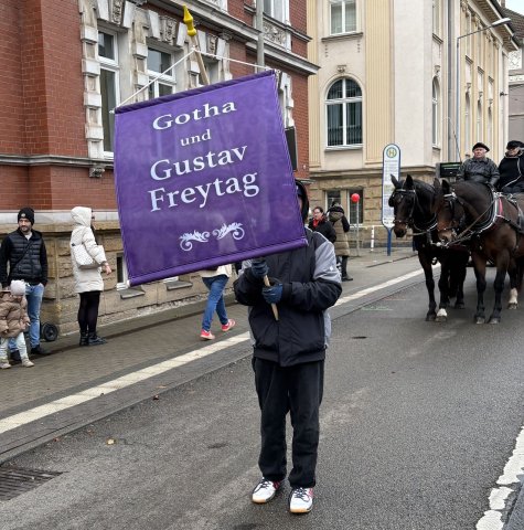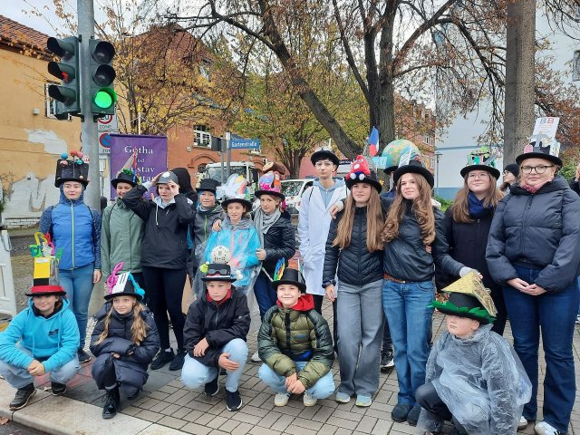 Das Motto der Sonderausstellung im Herzoglichen Museum „Gotha genial“ inspirierte uns dazu, unsere Unterrichtsfächer als geniale Köpfe zu präsentieren. Die Schüler des Kunstkurses der Klasse 12 gestalteten dafür je fach einen Zylinder mit dafür typischen Gegenständen. Unsere Trommlergruppe gab uns mit ihren Rhythmen den Takt fürs Laufen vor. Die Schüler des Wirtschaftsenglisch-Kurses der Klasse 9 zeugten sich im Business-Look und verteilten fleißig Flyer für dieses besondere Wahlpflichtfach. Die Schülerinnen des Kunstkurses der Klasse 11 trugen ihre selbstentworfenen Kostüme und wurden besonders beachtet. Unsere Starlights tanzten buchstäblich ohne Pause: vom Eintreffen am Stellplatz in der Gartenstraße gegen 12.00 Uhr und während des gesamten Umzuges bis zum Erreichen der Tribüne vor dem Herzoglichen Museum um 14.30 Uhr. Und so ganz nebenbei sei noch erwähnt, dass die Zwölftklässler trotz Regenschauern und heftigem Wind unsere beiden großen Werbebanner trugen, um die zahlreichen Zuschauer auf unseren Tag der offenen Tür am 17. Januar 2026 hinzuweisen.