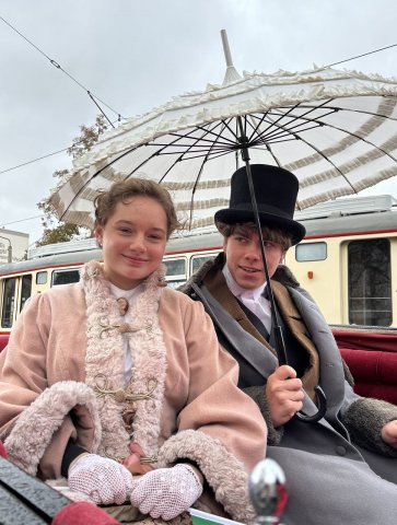 Angeführt wurde unser Auftritt natürlich von unserem Namenspatron Gustav Freytag und seiner Frau Anna - dargestellt von Magnus und Luna (Kl. 11) - die prächtig kostümiert in einer Kutsche saßen.