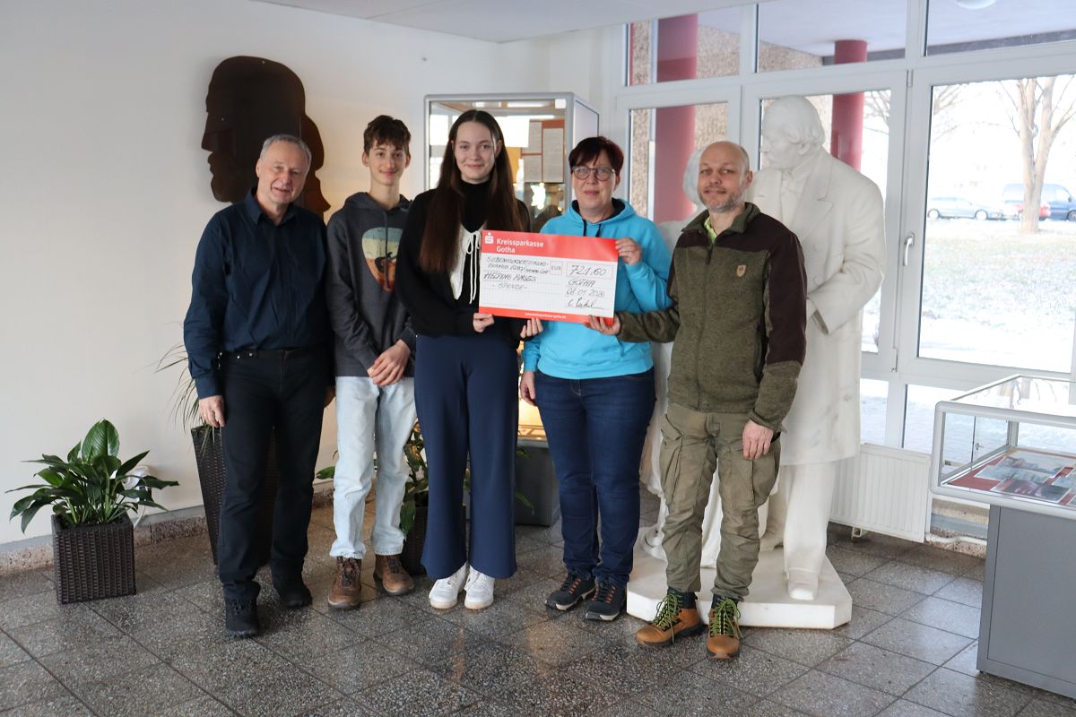 Am 8. Januar haben Jette (Kl.11) und Frederic (Kl.9) gemeinsam unserem Schulleiter einen Spendenscheck in Höhe von 721,60 Euro an Frau Greiner und Herrn Bausewein vom Verein Helping Angels übergeben. Das Geld wurde während unserer Weihnachtsestrade im Dezember eingesammelt und soll dazu dienen, die Arbeit des Vereins zu unterstützen und dazu beitragen, letzte Wünsche schwerkranker Menschen zu erfüllen.