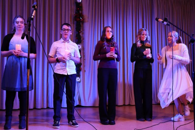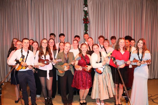 Die „Vier Kerzen Geschichte“, erzählt von Ethik-Schülern der 8. Klassen, erinnerte daran, wie wichtig gerade heute die Hoffnung ist. Jette ging in ihrem poetry slam der Frage nach, wie sie sein möchte und bekam für ihren engagierten Auftritt viel Applaus. Die Gruppe BANATOS begeisterte mit ihrem Bachtanz. Anschließend präsentierten die Musikkurse der Oberstufe den Jingle bells rock mit ihren Ukulelen.