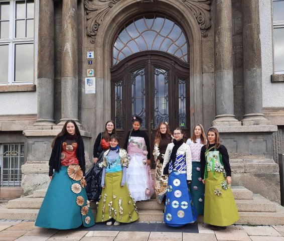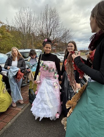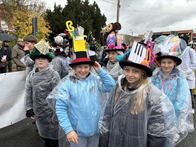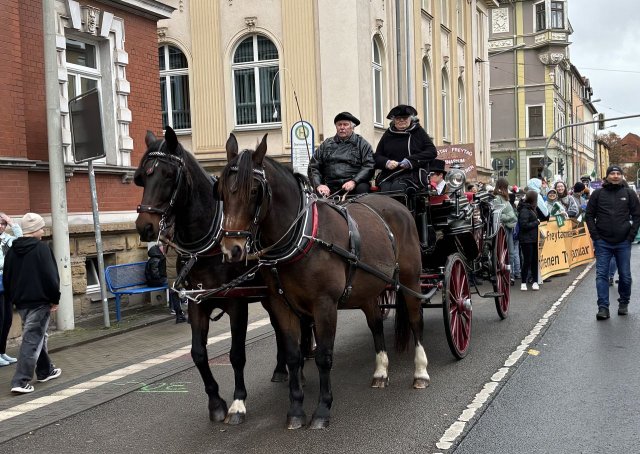 Das Motto der Sonderausstellung im Herzoglichen Museum „Gotha genial“ inspirierte uns dazu, unsere Unterrichtsfächer als geniale Köpfe zu präsentieren. Die Schüler des Kunstkurses der Klasse 12 gestalteten dafür je fach einen Zylinder mit dafür typischen Gegenständen. Unsere Trommlergruppe gab uns mit ihren Rhythmen den Takt fürs Laufen vor. Die Schüler des Wirtschaftsenglisch-Kurses der Klasse 9 zeugten sich im Business-Look und verteilten fleißig Flyer für dieses besondere Wahlpflichtfach. Die Schülerinnen des Kunstkurses der Klasse 11 trugen ihre selbstentworfenen Kostüme und wurden besonders beachtet. Unsere Starlights tanzten buchstäblich ohne Pause: vom Eintreffen am Stellplatz in der Gartenstraße gegen 12.00 Uhr und während des gesamten Umzuges bis zum Erreichen der Tribüne vor dem Herzoglichen Museum um 14.30 Uhr. Und so ganz nebenbei sei noch erwähnt, dass die Zwölftklässler trotz Regenschauern und heftigem Wind unsere beiden großen Werbebanner trugen, um die zahlreichen Zuschauer auf unseren Tag der offenen Tür am 17. Januar 2026 hinzuweisen.