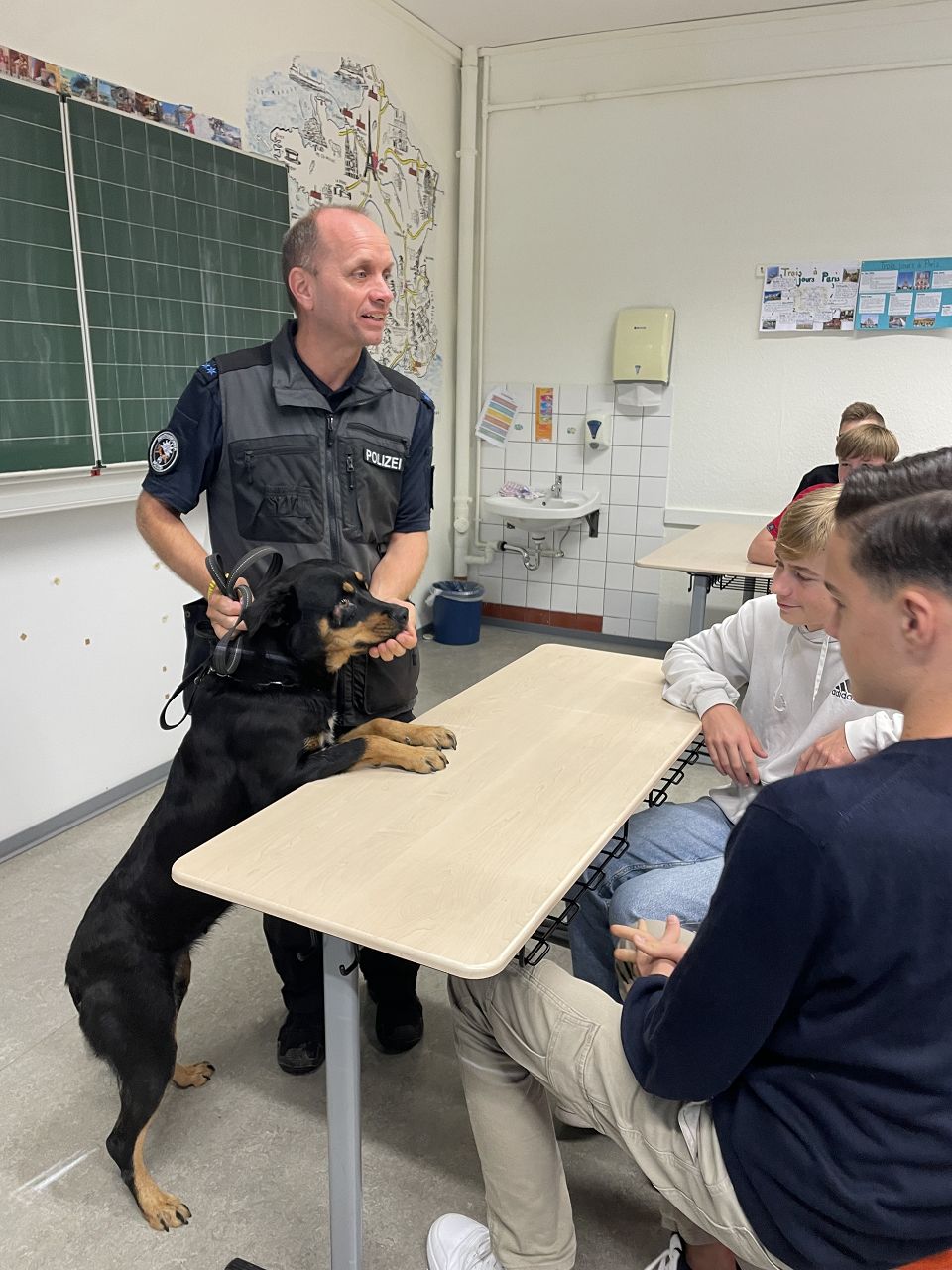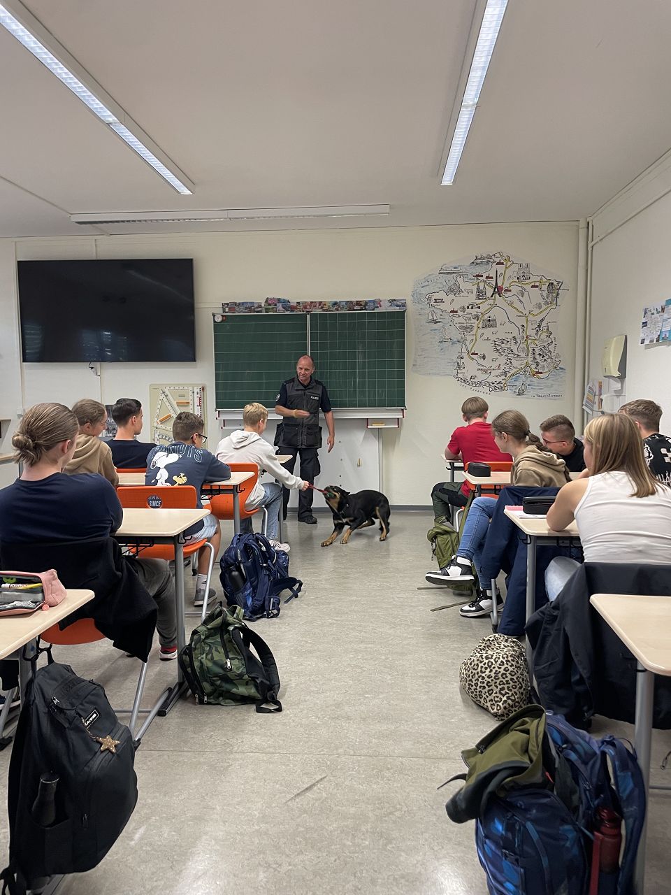 Am 19. September 2025 nahmen die neunten Klassen an einem besonderen Projekt teil: Drogenprävention in Kombination mit einer Vorstellung des Berufs des Polizeihundeführers.
