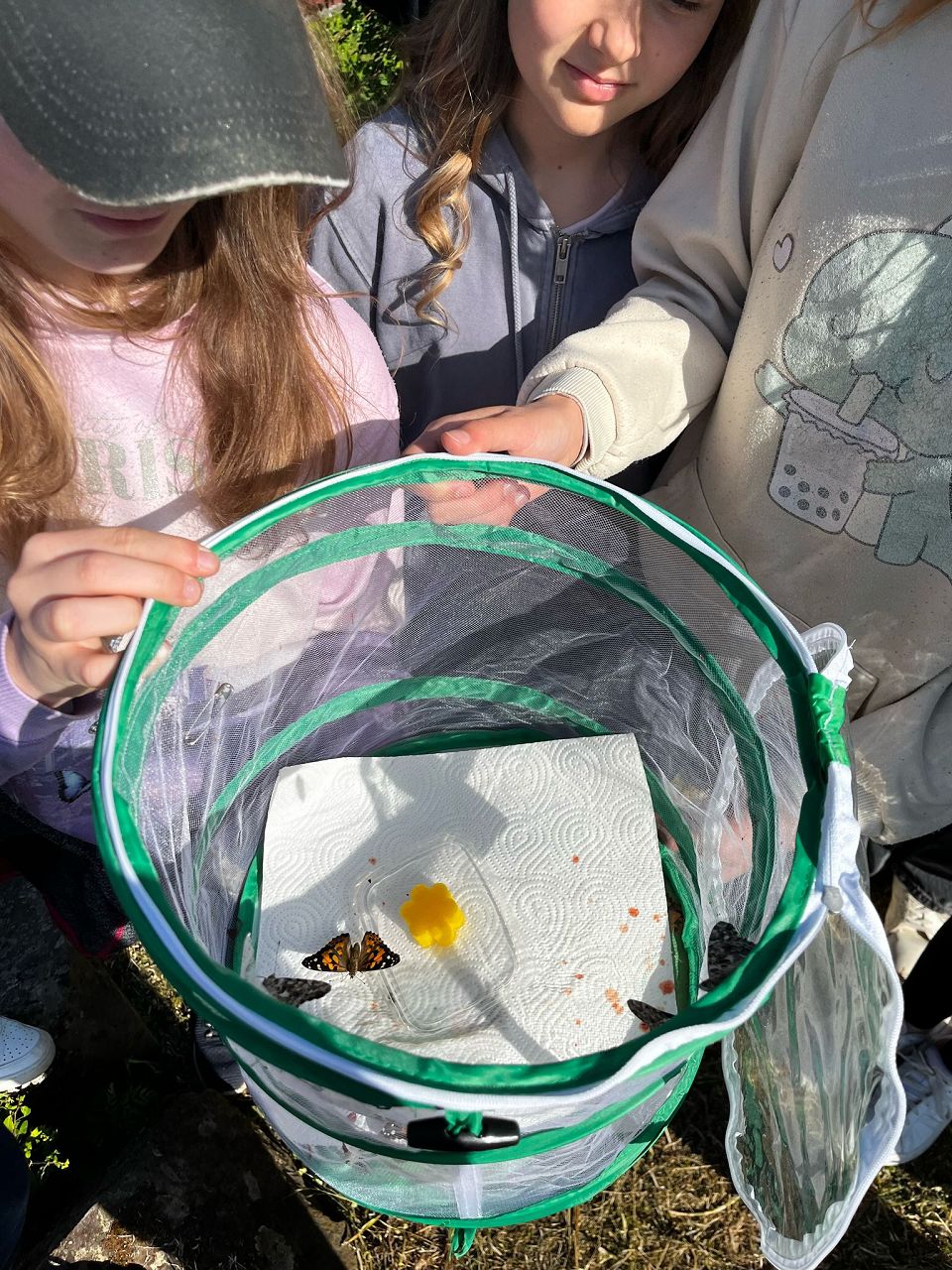 Auch in diesem Schuljahr war es Schülern und Schülerinnen aller Alterstufen im Fachraum Biologie möglich, Raupen beim Fressen und Verpuppen zuzusehen. Nach einer Woche im Puppenstadium sind gestern, am 20.05.25, alle sieben Distelfalter geschlüpft, sodass sie heute auf dem Schulgelände in die Freiheit entlassen werden konnten.