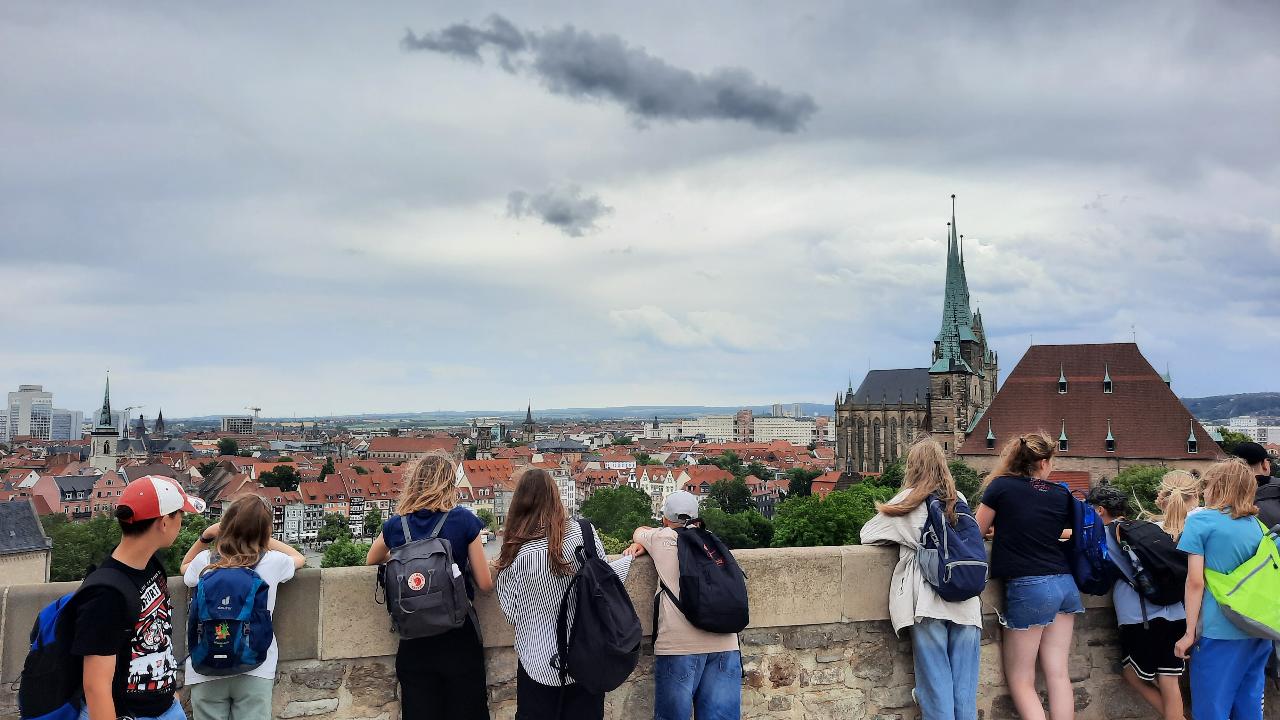 Nach der Lektüre des Romans "Jonna im Labyrinth der Zeit" im Deutschunterricht besuchte die Klasse 7-3 die Landeshauptstadt Erfurt, in der die Handlung des Romans stattfindet. Dazu erstellten die Schülerinnen und Schüler im Unterricht kurze Beiträge zu allen im Buch genannten Standorten, die wir anschließend als Jonna-Stadttour gemeinsam abliefen. Natürlich zählte dazu auch der Besuch von Jonnas Lieblings-Eiscafé. Da die Hauptfigur des Romans durch real nicht existente, geheime Gänge unter dem Domplatz eine Zeitreise macht, bekamen die Schüler*innen anschließend eine Führung durch die Horchgänge des Petersberges, um die Stimmung aufnehmen zu können. Ein herzliches Dankeschön an unseren Guide Dr. Harald Mittelsdorf für die interessante Führung durch die Citadelle und die Geheimgänge!
