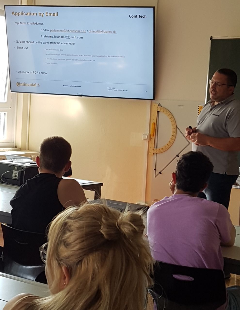 Eines der letzten Themen im Kurs „Wirtschaftsenglisch“ in Klasse 10 war Application. Vorher mit dem Ausbildungsleiter der Continental AG Waltershausen, Herrn Laue, vereinbart, haben wir einige Lebensläufe und Bewerbungsschreiben an ihn geschickt.