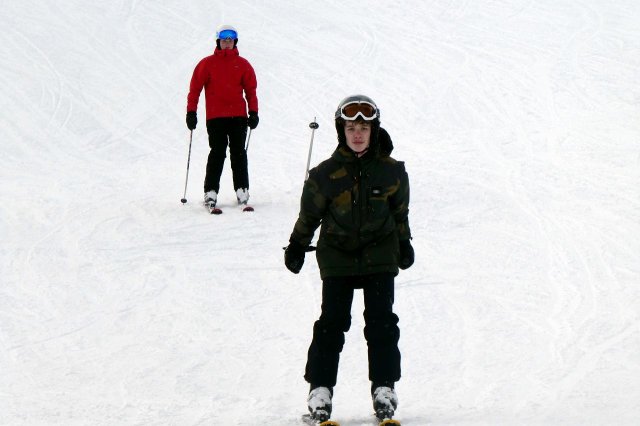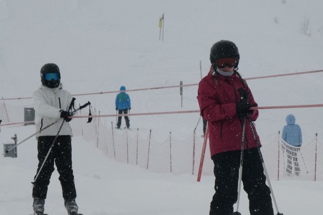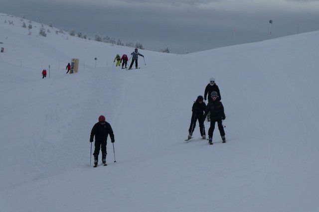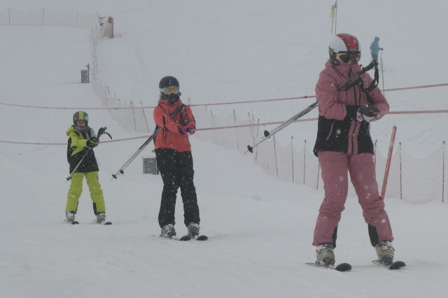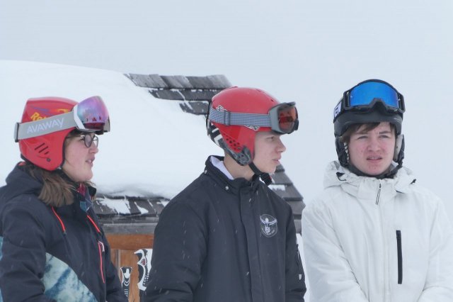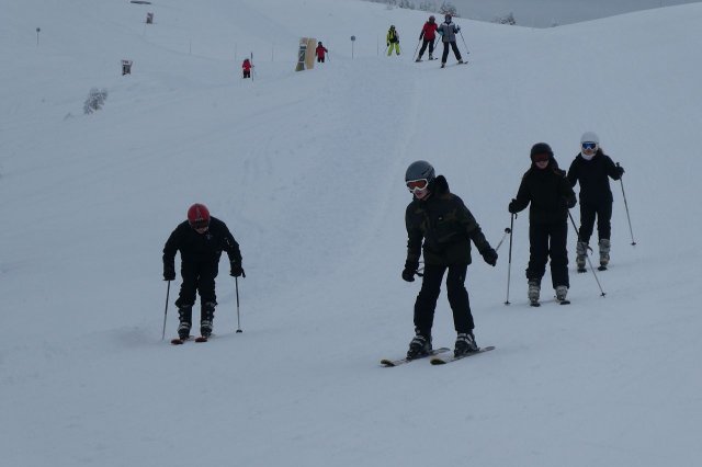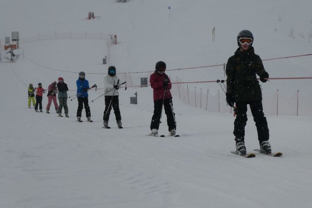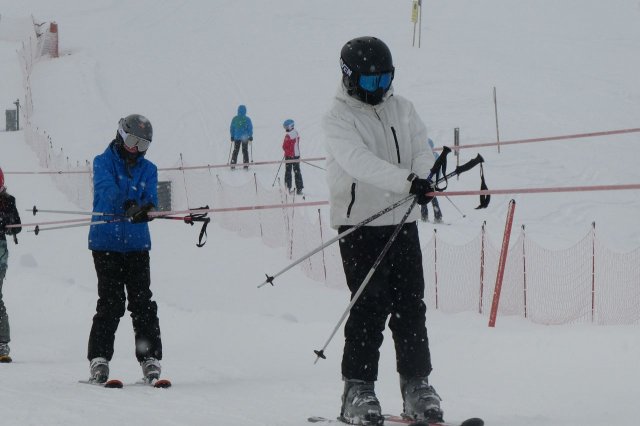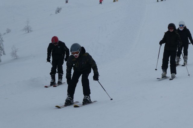 Die Gruppe A hat heute „ums überleben gekämpft“, wie Herr H., der Gruppenleiter, meinte. Es gab zwar ein paar Stürze, aber sie sind immer wieder aufgestanden. Die Gruppe übte unterschiedlich große Kurven auf der blauen Piste. Sie haben den Tag jedoch gut gemeistert.