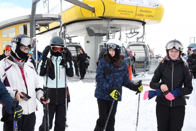 Auch an diesem Tag ging es so schnell wie möglich hinauf ins Skigebiet. Während die B-Gruppe mit Frau R. auf den blauen Pisten im Tal Ski-Techniken verfeinerte, ging es für alle anderen Gruppen, auch unsere "blutigen Anfänger" der Gruppe A, hoch in das Skigebiet Jochtal.