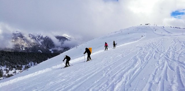 Bei den B-Gruppen war heute einiges los. Die Gruppe von Herr L. hat fleißig geübt und sogar eine kleine Prüfung absolviert. Zur Belohnung konnten sie dann die wunderschöne Aussicht auf der Panorama Piste genießen. Und auch für die Gruppe von Frau R. ging es heute auf die Panorama Piste. Diese hat sogar die steile rote Piste absolviert und auch fleißig geübt. Leider kam es dabei zu Stürzen, aber den Verletzten geht es soweit gut.