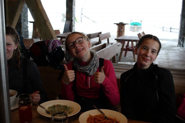 Nach 2-3 Stunden fanden sich die hungrigen Skifahrer*innen zusammen für das ersehnte Mittagessen. Zwischen ein paar Gerichten konnten wir frei entscheiden. Als die Pause vorbei war ging das spannende Abenteuer weiter und die Gruppen separierten sich wieder.