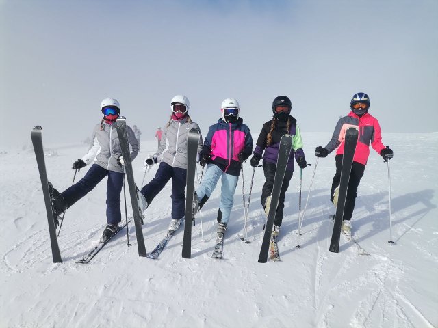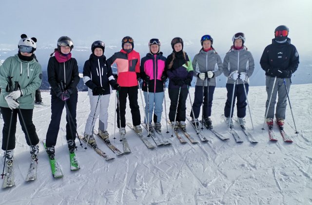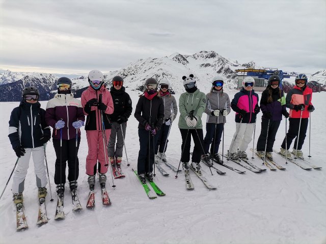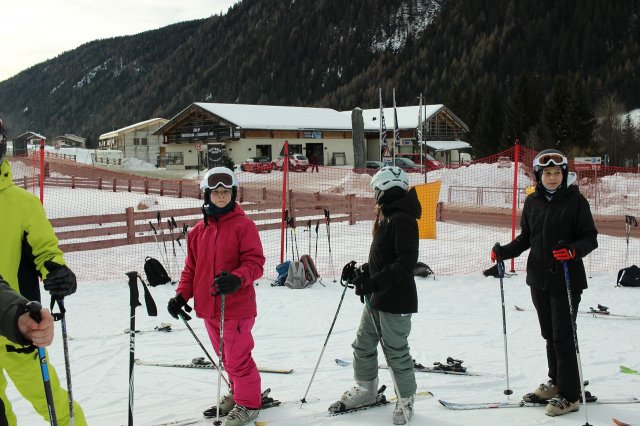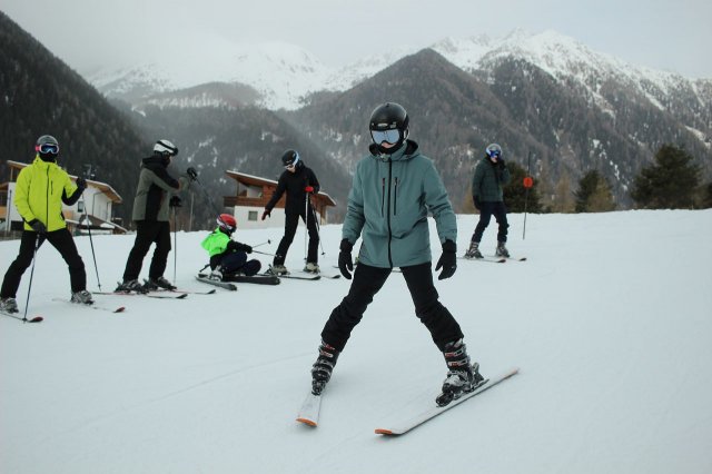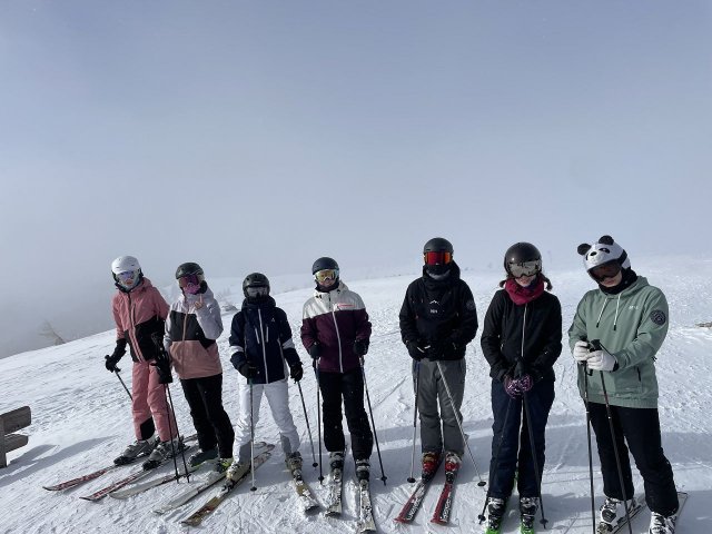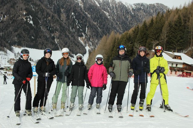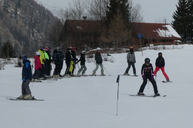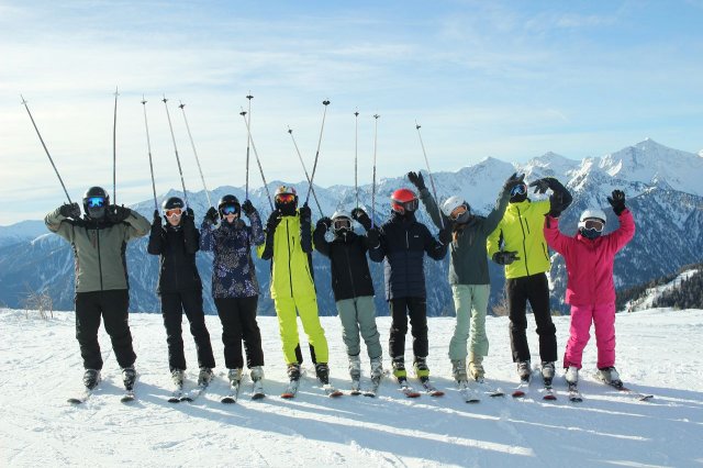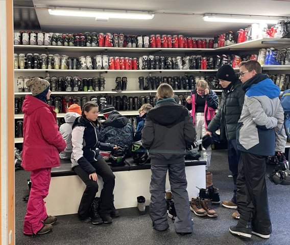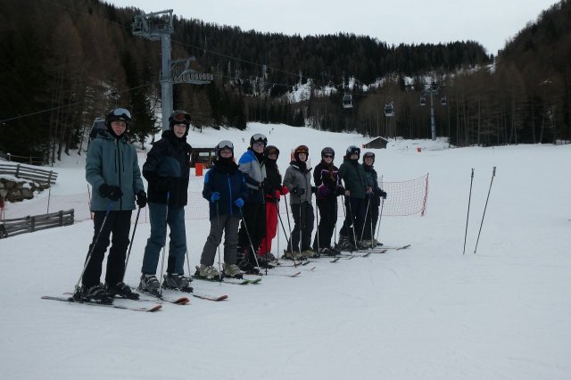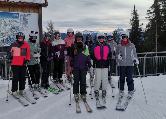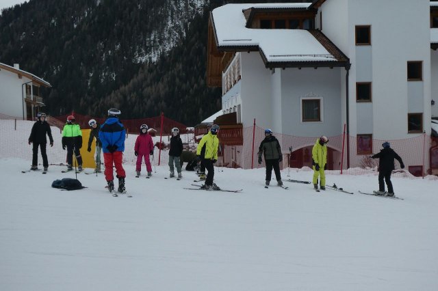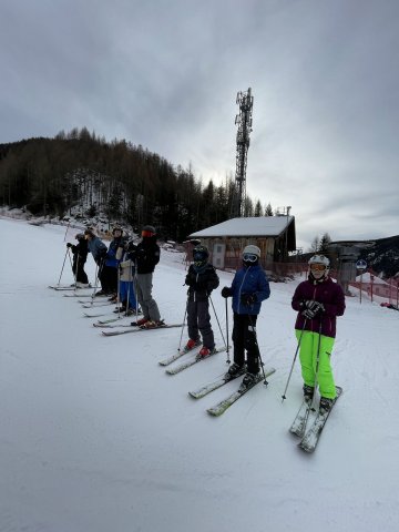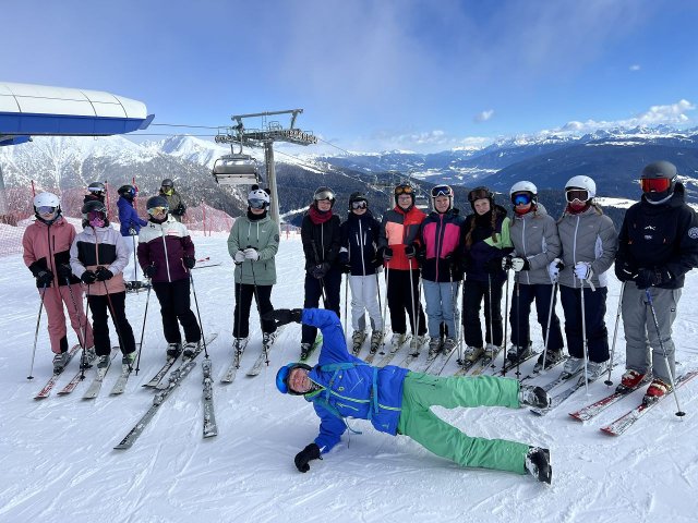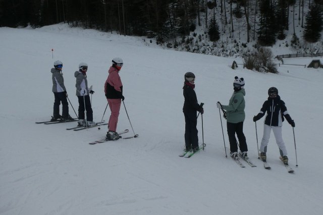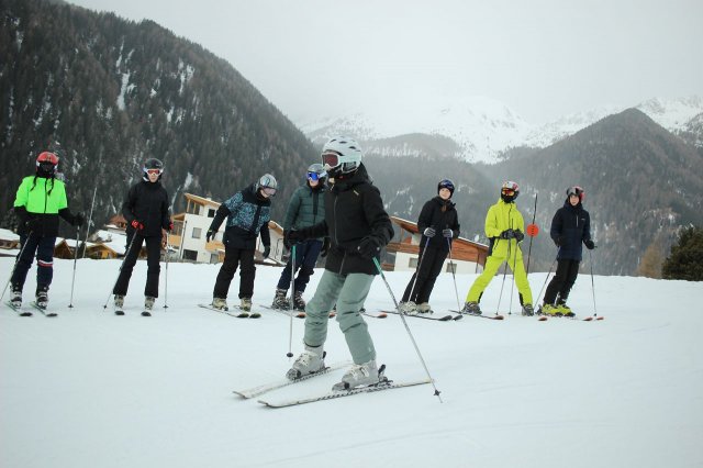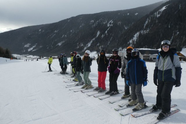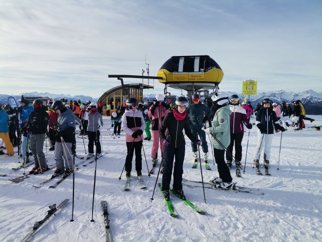 Heute haben wir eine Stunde eher gefrühstückt, da wir noch unsere Skiausrüstung holen und anprobieren mussten. Nach dem Frühstück ging es dann halb 9 voller Vorfreude zum Bus. Leider konnten 2 Schüler krankheitsbedingt nicht mitfahren. Im Skigebiet haben wir uns dann in unseren 4 Gruppen (zwei Anfänger eine Amateur und eine Profigruppe) mit den dazugehörigen Skilehrern getroffen. Daraufhin kam das Wichtigste: Die Aufwärmung und Dehnung der Muskeln. Anschließend haben Herr Laske und Herr Hess den Anfängern die „Basics“ des Skifahrens beigebracht, während die anderen 2 Gruppen mit Frau Raddatz und Herr Hollander direkt über die Piste gefegt sind.