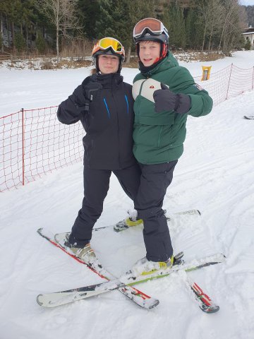 Nach dem Mittagessen verbesserte sich das Wetter etwas und man konnte wieder mehr sehen. Zum Abschluss sind wir noch ein paar mal die Panoramapiste und die auf sie folgenden Parkours gefahren. Dabei hat Leonie leider aus versehen einen ihrer Skier kaputt gefahren (zum Glück erst am letzten Tag). Heute ging es leider schon 15 Uhr zum Depot zurück, wo wir dann die Skisachen wieder abgaben oder gegebenenfalls wieder mit genommen haben. Nach der Rückfahrt mussten wir alle schon die Sachen packen und es gab noch ein letztes mal Abendessen in unsere Unterkunft.